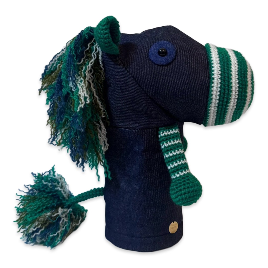 Oman(オーマン) 本体は耐久性と色の発色の良さを重視したアクリル毛糸と倉敷染のアップサイクルデニムを使用。裏地には高価生地ストレッチボアを使用したドライバー専用のヘッドカバーです。