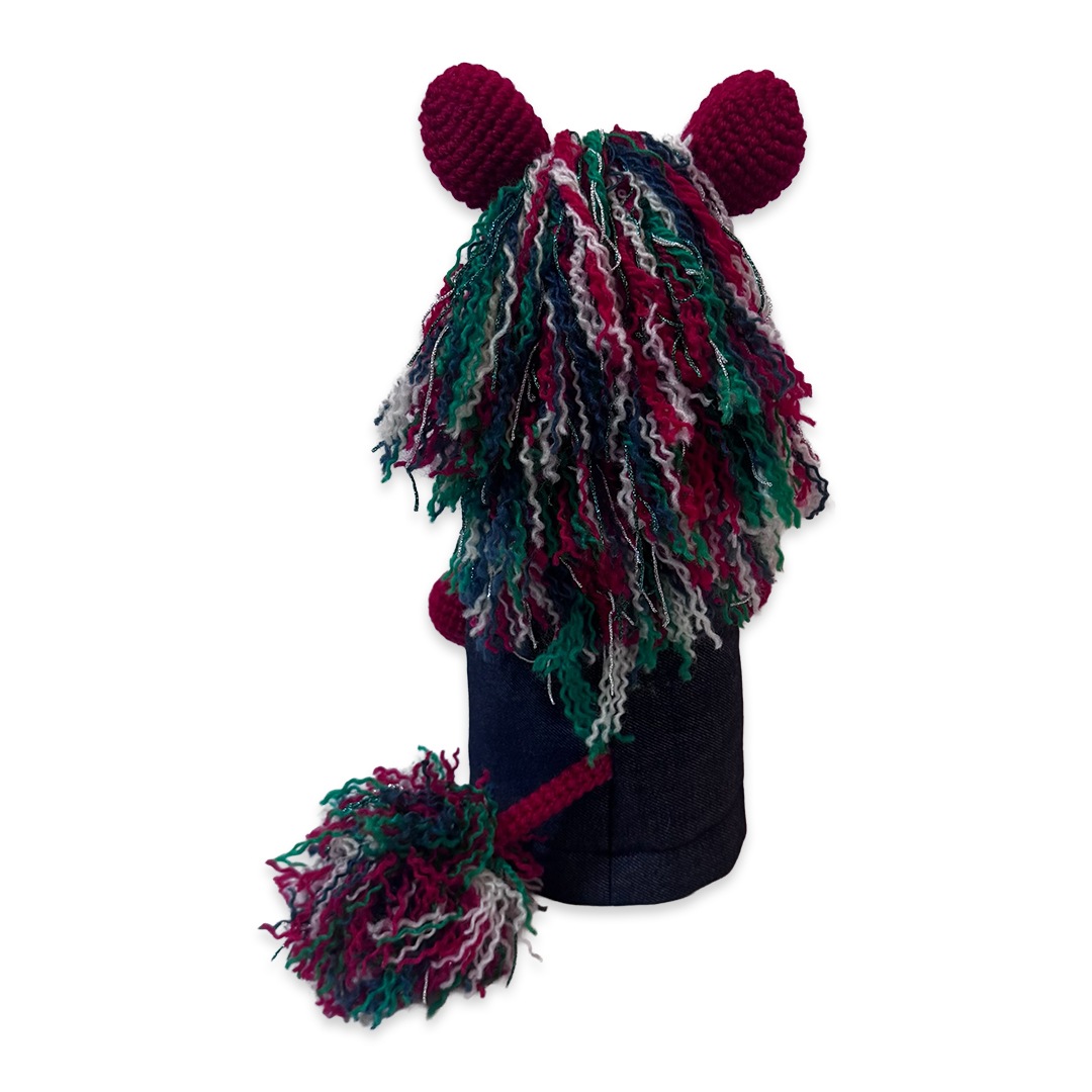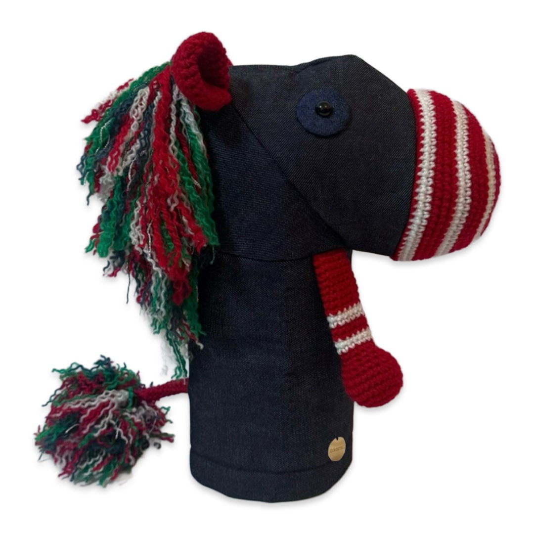 本体は耐久性と色の発色の良さを重視したアクリル毛糸と倉敷染のアップサイクルデニムを使用。裏地には高価生地ストレッチボアを使用したドライバー専用のヘッドカバーです。