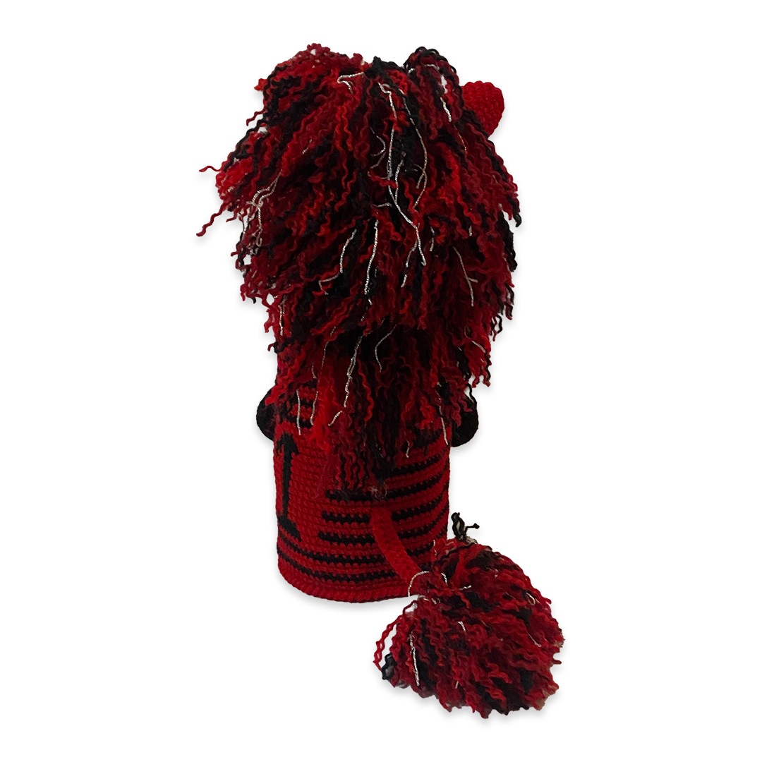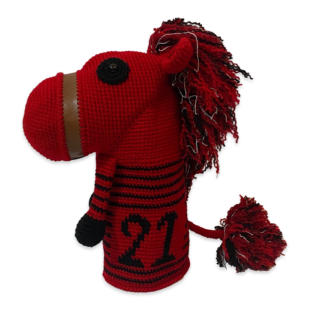 本体は耐久性と色の発色の良さを重視したアクリル毛糸を使用。一部牛革をプラスして高級感溢れるデザインに。裏地には高価生地ストレッチボアを使用したドライバー専用のヘッドカバーです。