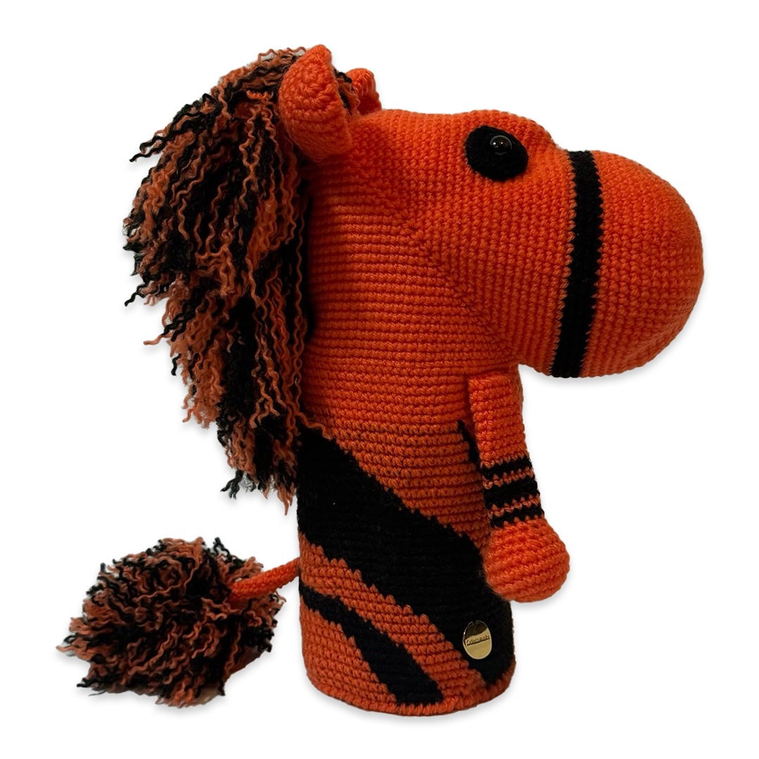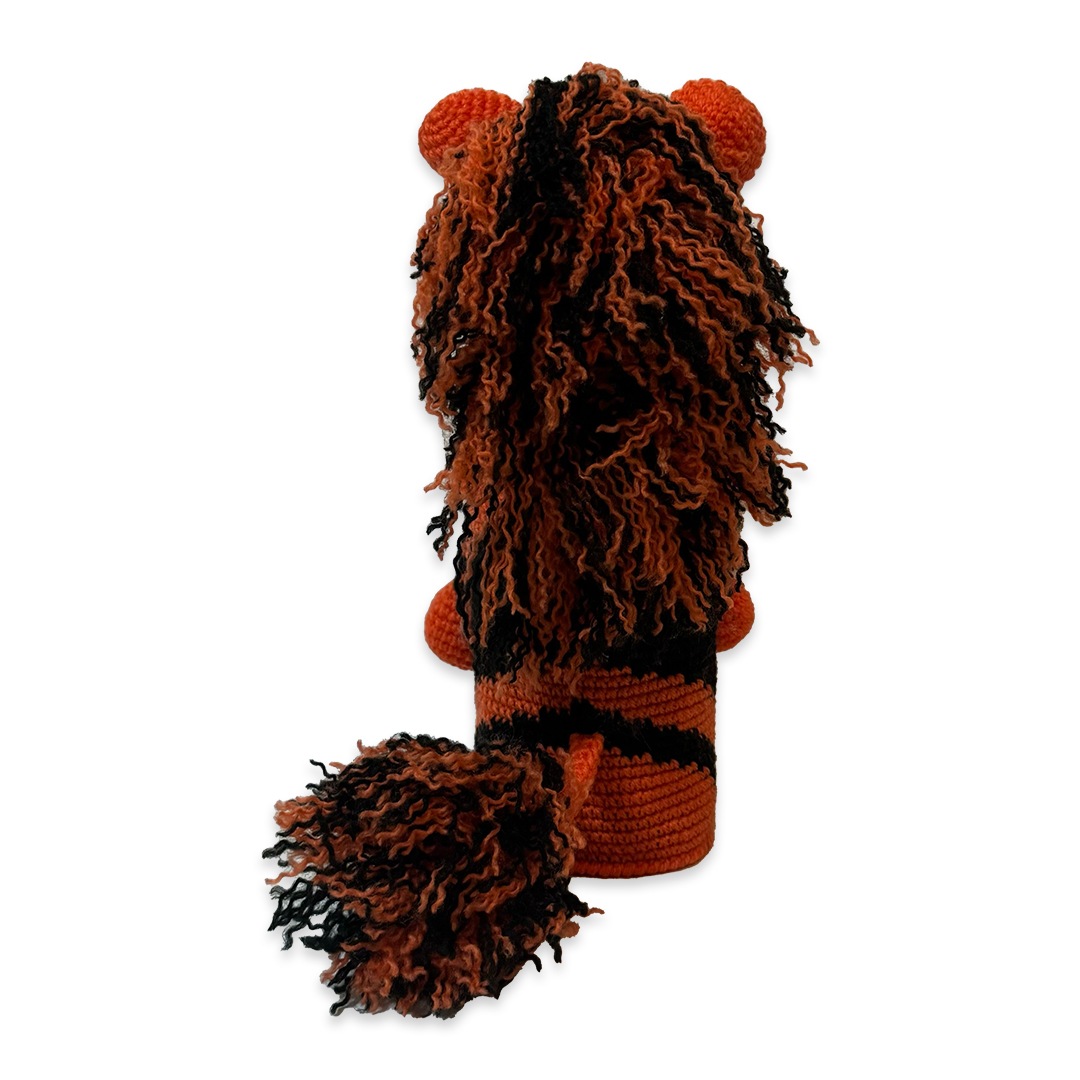 本体は耐久性と色の発色の良さを重視したアクリル毛糸を使用。裏地には高価生地ストレッチボアを使用したドライバー専用のヘッドカバーです。