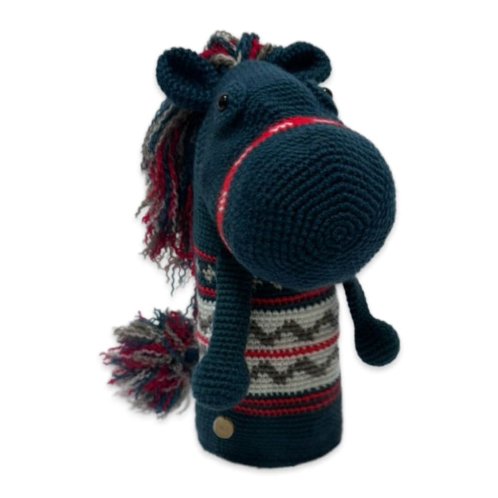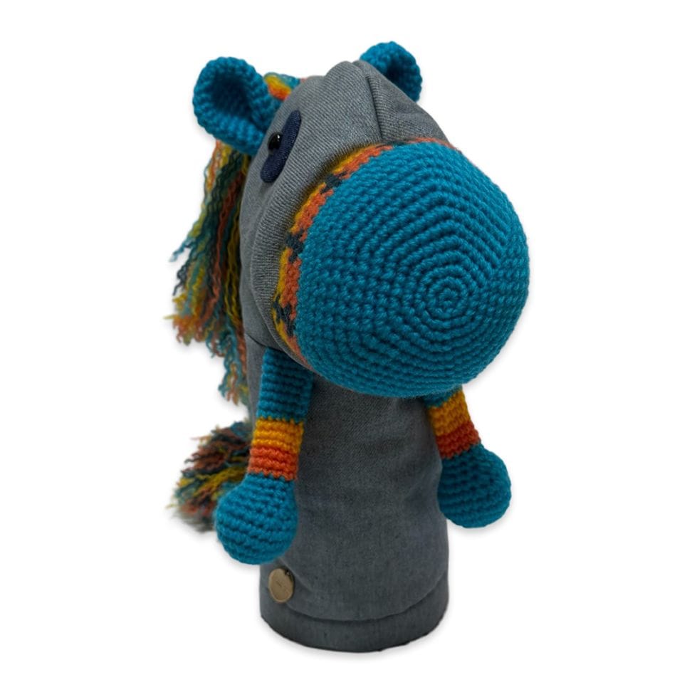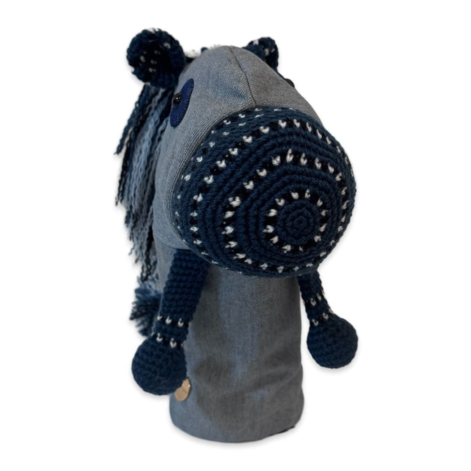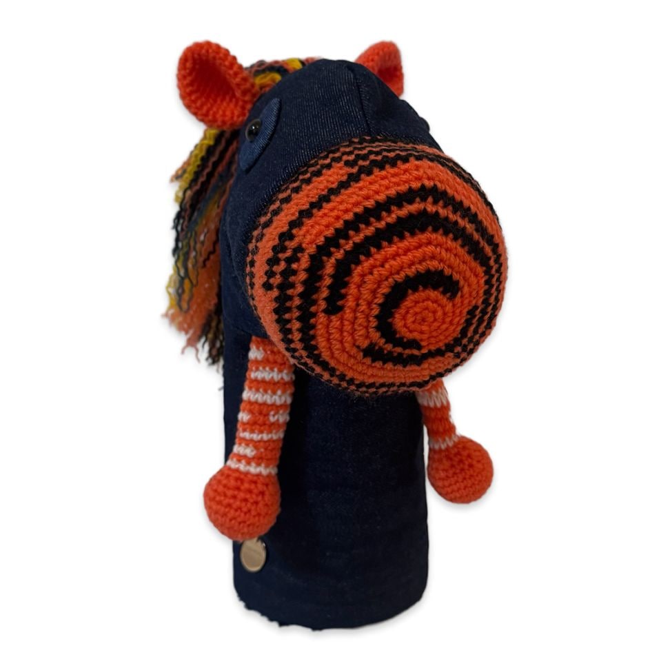 本体は耐久性と色の発色の良さを重視したアクリル毛糸と倉敷染のリサイクルデニムを使用。裏地には高価生地ストレッチボアを使用したドライバー専用のヘッドカバーです。